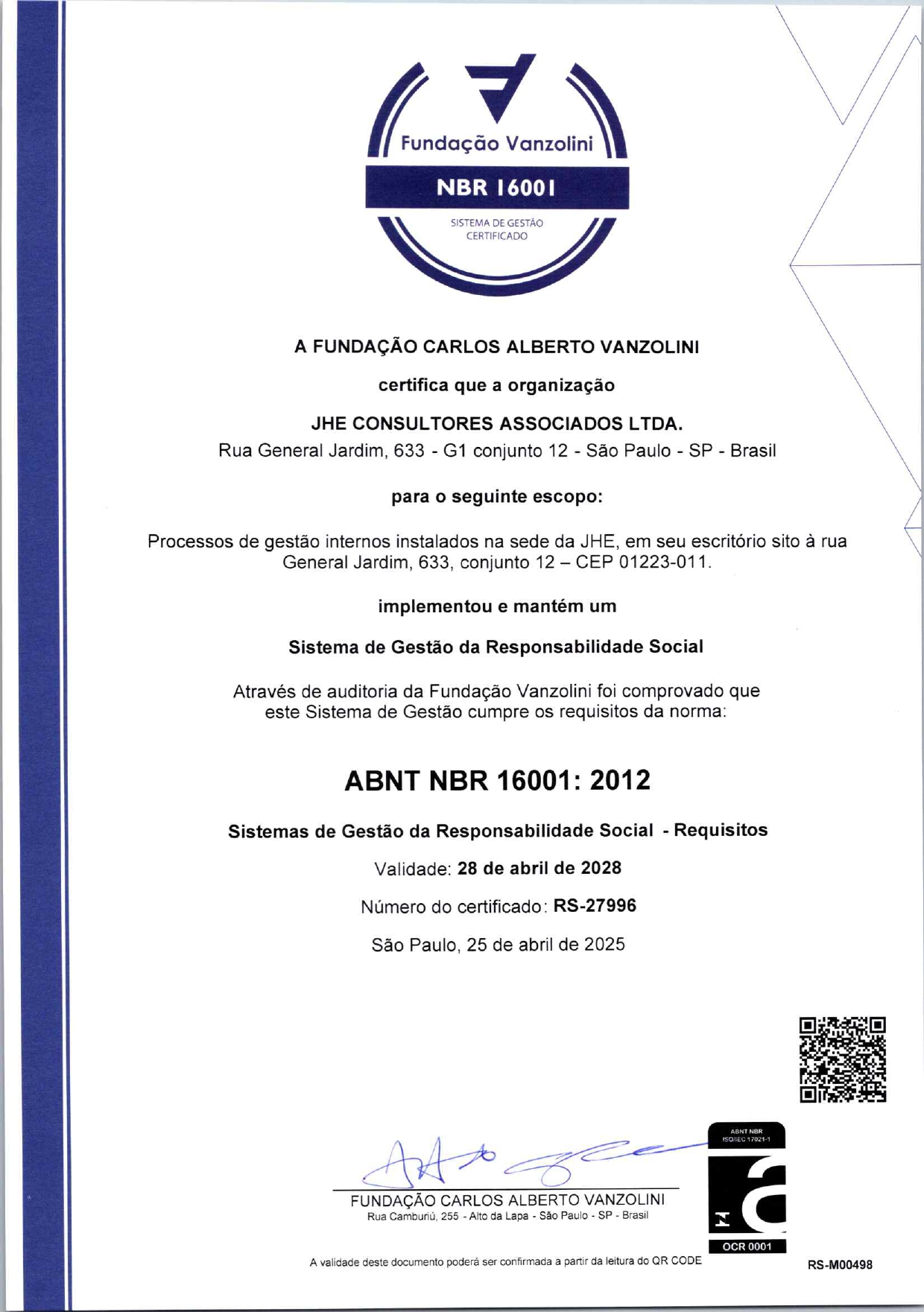 Certificada desde 2009 no SISTEMA DE GESTÃO DA QUALIDADE, posteriormente adquirindo a certificação QUALIHAB Nível 6, a JHE decidiu em 2011 incrementar suas certificações incorporando as normas MEIO AMBIENTE, SEGURANÇA e SAÚDE OCUPACIONAL, por entender que seu time é seu principal capital. Associado a este conceito, a empresa acredita que as boas relações com o entorno são definitivamente a saída para um futuro melhor, de maneira que o agir consciente torna-se um dever.
